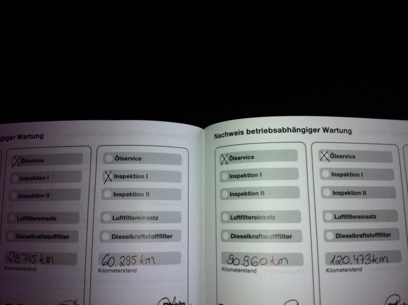 Ein drittes Bildchen habe ich auch noch. Es zeigt das Serviceheft. Der Händler hat 2x einen Ölservice in Folge gemacht - kann das lt. Anzeige überhaupt möglich sein?Normalerweise sollten doch Inspektion und Ölservice im Wechsel sein? Ausserdem müssten doch nach 3x Ölservice - Kraftstofffilter und Luftfilter gewechselt werden - da dort keine Kreuzchen sind, wurde das auch nicht gemacht - diese Tatsachen erzeugen bei mir ein unangenehmes Gefühl in der Magengegend. Vor allem war im Kaufvertrag festgehalten, dass er die fällige Inspektion erledigt. Was denkt Ihr?