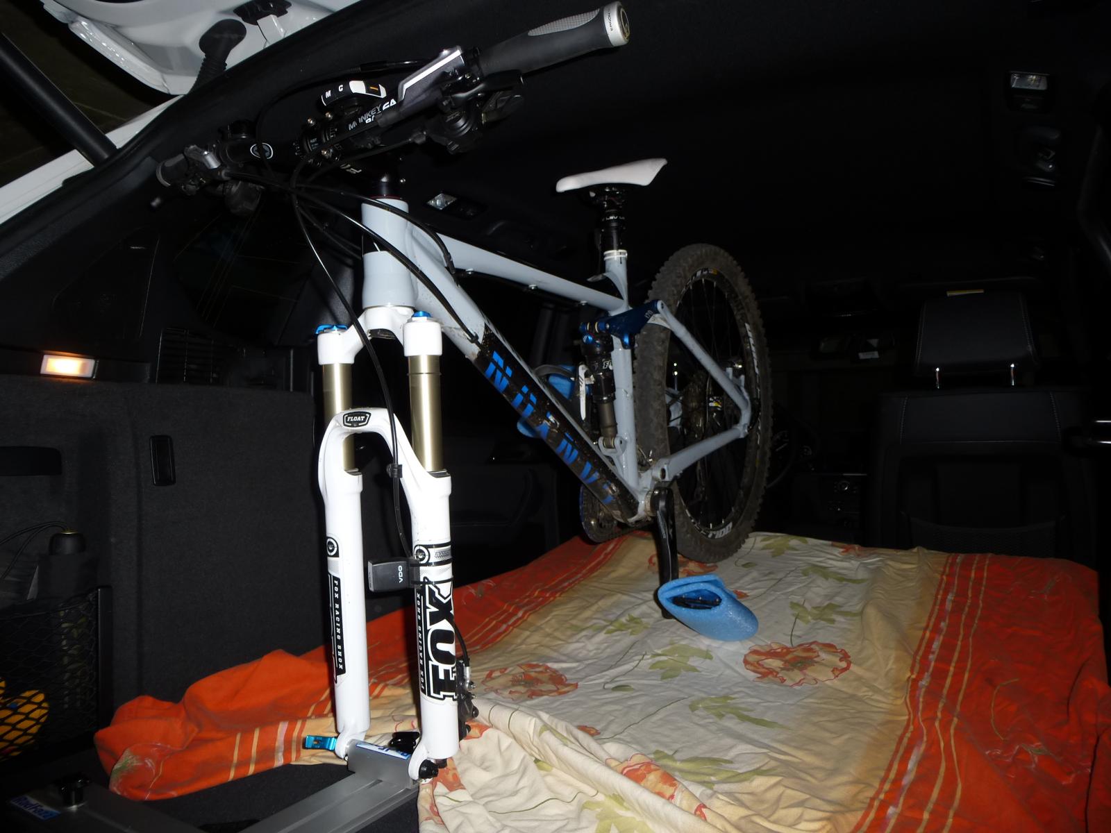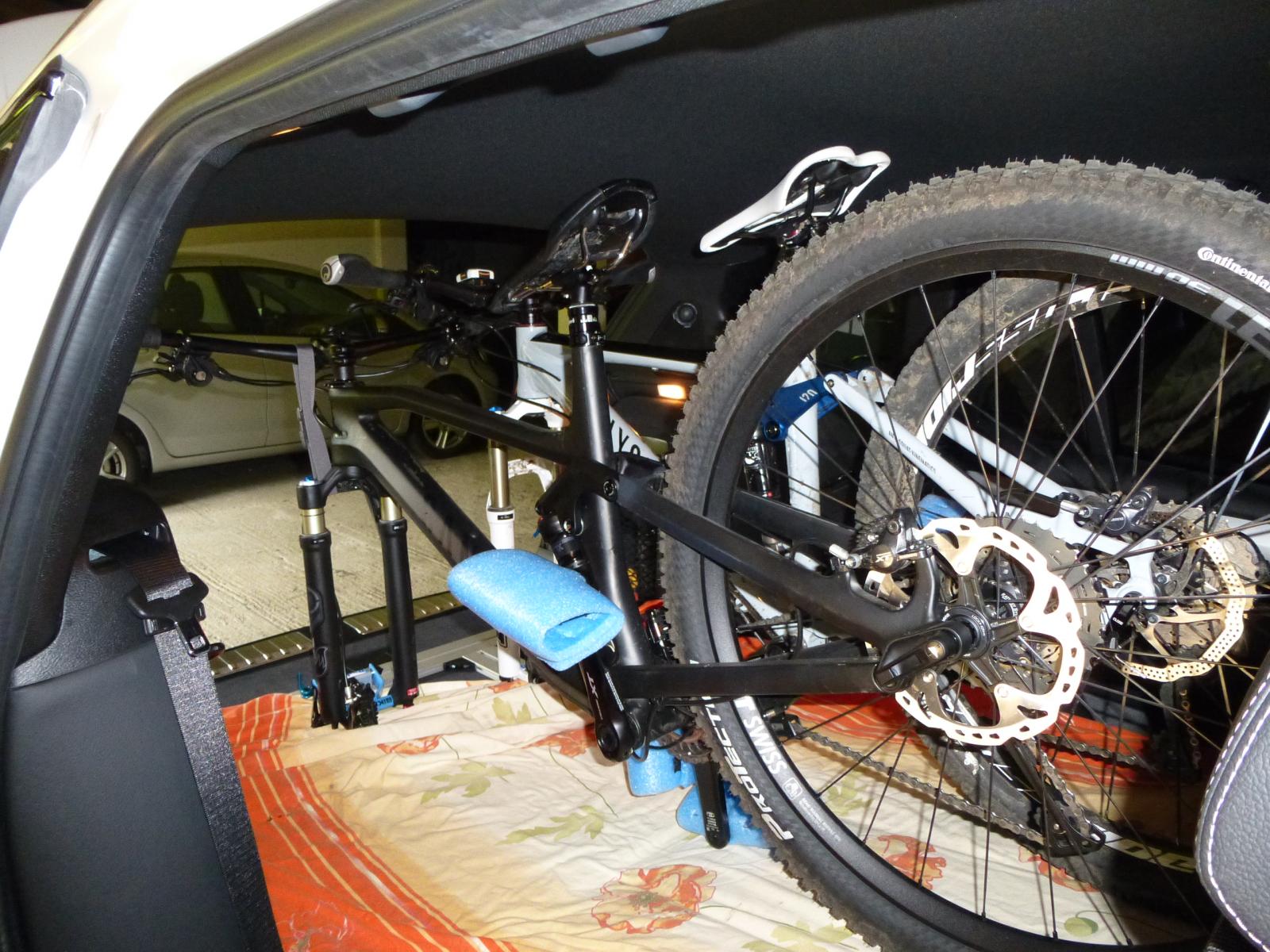 Mittlerweile transportiere ich zwei 27,5" Fullys mit 140mm Federweg. Jeweils Gabel und Sattelstütze abgesenkt.