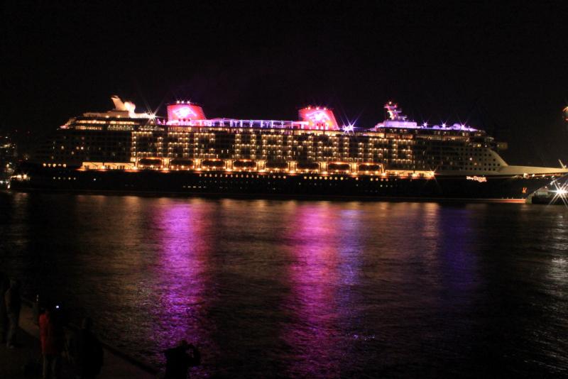Gestern Abend um 21.50 Uhr an den Hamburger Landungsbrücken, gefühlte -10°C und die Disney Dream dockt bei Blohm&Voss aus.