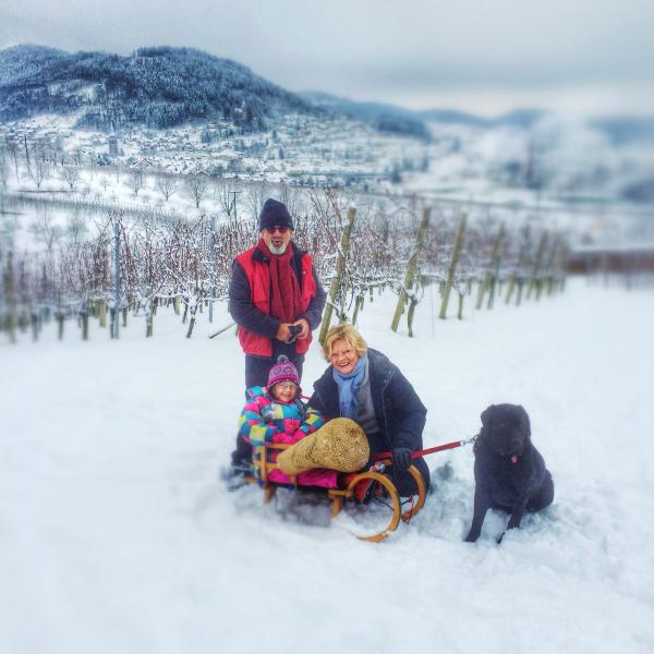 Vielen Dank für den verschneiten Weinberg, da hat sogar deine Enkeltochter Spass.