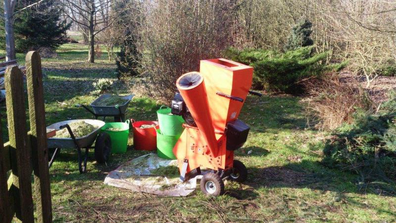 Hier steht das Equipment zur Baumschnittzerkleinerung. Das Zeug muß dann nur noch auf den Beeten verteilt werden, damit die Unkräuter nicht so sprießen.