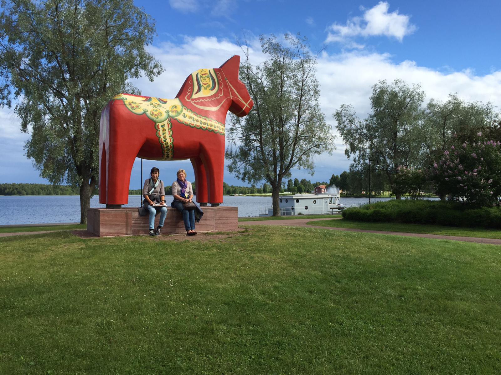 Eines der typischen, roten Dalarna-Pferdchen in Übergröße und zwei alberne deutsche Urlauberinnen