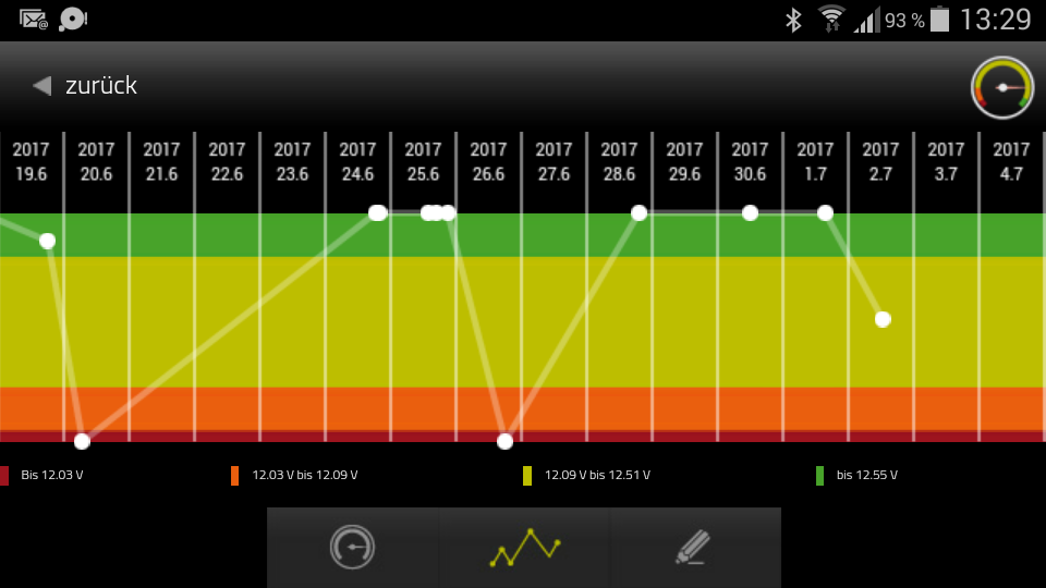 Auto steht seit gestern nun vor der Tür . Navi-Rechner ist abgestöpselt. Bisher ohne Fahrbetrieb 13,2V volle Spannung=bisher kein ungewollter Verbraucher ! Hat aber noch nicht viel zusagen, das hatte ich kürzlich 3Tage (sh.Screenshot App weiter unten) lang und danach schlug der Fehlerteufel wieder zu. Schaun mer mal...