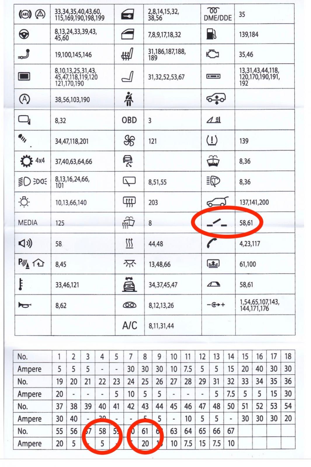Für das Panoramadach ist die Sicherung 58/61 zuständig. Die Sicherung 58 soll 5A und die Sicherung 61 soll 20A betragen.