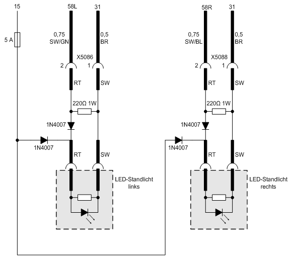 Die LEDs werden mit einem kurzen Adapter-Kabel geliefert (das sind die Adern, die ich im Schaltplan mit RT für die rote Ader und SW für die schwarze Ader gekennzeichnet habe). Das Adapterkabel bildet den Übergang vom X3-Stecker (X5086 li. und X5088 re.), der normalerweise auf die serienmäßigen Standlicht-Lampen aufgesteckt wird, zu dem Steckersystem an den LEDs.
