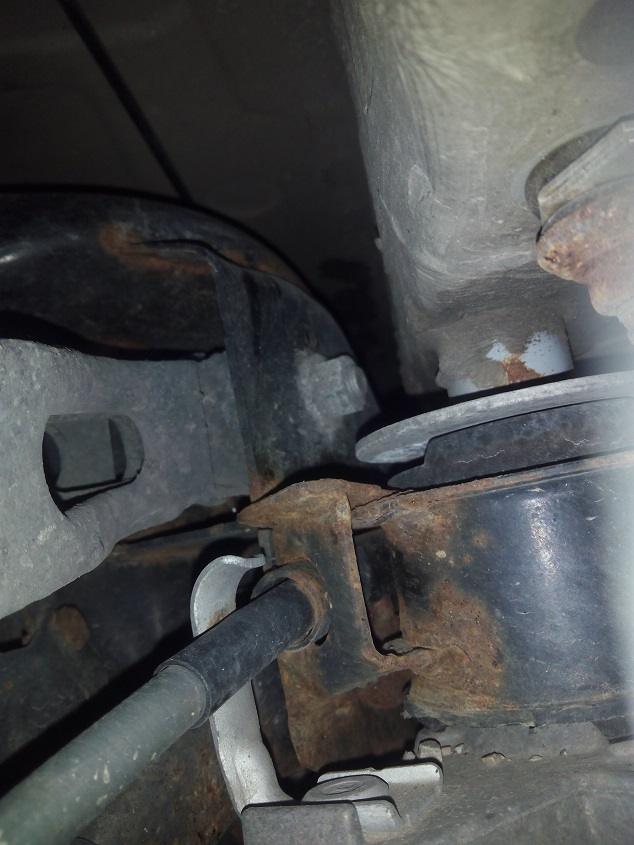 Die Sicherungsmutter, welche die Bundschraube des inneren Traggelenkes sichert ist gebrochen, das Gewinde der Bundschraube hat ein Langloch nun in den Achsträger gefräst.