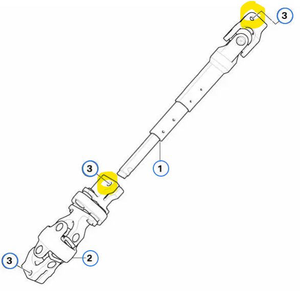 4. Nach dem Entfernen der zwei Schrauben an der Lenkspindel könnt ihr den Schaft der Lenksäule zurückziehen (Bild 1, unter dem gelb markierten Bereich). Am besten macht ihr das zu zweit, da die Lenksäule mit Längsriefen in die Längsführung der Lenkspindel eingesetzt ist. Bei mir ging es relativ einfach. Mit ein bisschen Gefühl sollte sich das lösen.