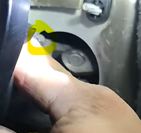 5. Zurück in den Fahrerfußraum. Jetzt lösen wir die Buchse von der Karosseriescheibe. Die Buchse hat Rasthaken und hält so die Scheibe. Mit ein bisschen Kraft die Scheibe von den Rasthaken lösen. Anschließend kann man die Buchse vorsichtig weiten (ist an einer Stelle gesägt und aus flexiblem Kunststoff) und von der Lenksäule entfernen.