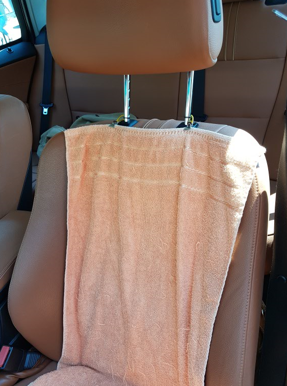 Ich habe zwei Ersatz-Handtuchhalter genommen und diese mit schwarzen Kabelbindern am Fahrersitz befestigt .Damit es nicht ganz so schlimm aussieht, habe ich, halbwegs passend zu den Sitzen, die gelbe Variante gewählt. So kann ich nun auch immer zwischendurch, bei längeren Fahrten, das Handtuch wechseln.
