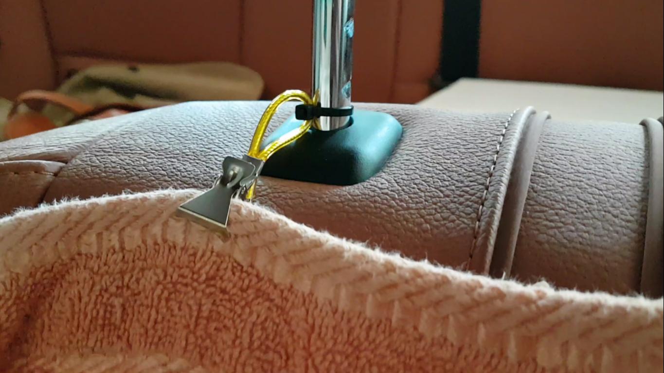 Ursprünglich hatte ich vor, schlicht die Fahrer-Kopfstütze zu demontieren, um die ja bereits vorhandenen Löcher in den Handtuchhaltern zu nutzen; da ich aber die aktiven Kopfstützen habe und nichts kaputt machen wollte, habe ich mich für diesen "Workaround" entschieden.