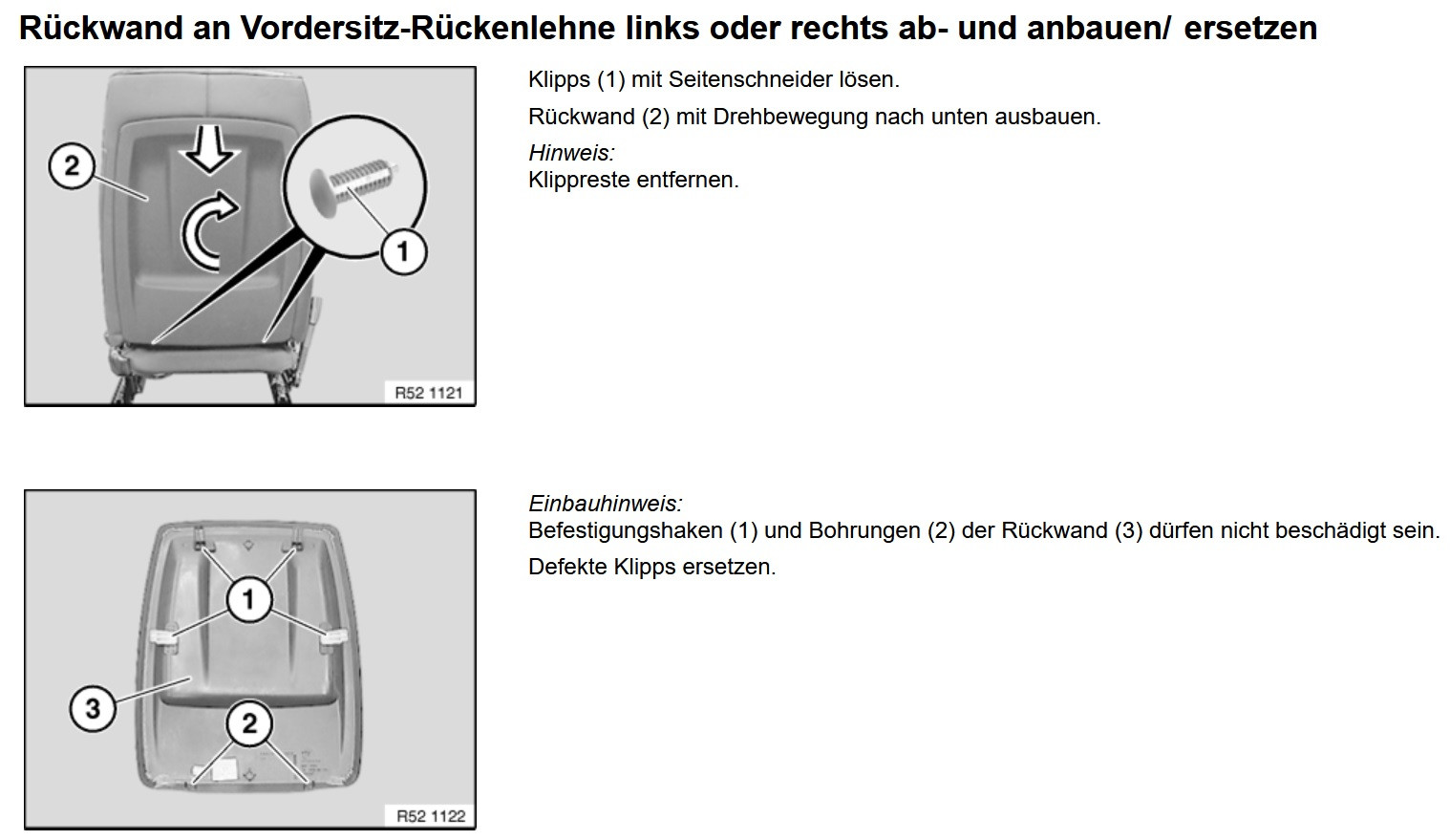 mein X3 ist Bj. 2013, für einen Brettertransport habe ich die aktive Beifahrerkopfstütze nach oben herausgerissen. Dabei ist das Kabel in dem Linken Chromrohr leider abgerissen. Seitdem habe ich eine Fehlermeldung, die nur von der Werkstatt gelöscht werden kann. Es gibt im Internet ein Video hierzu. Man muss an der Sitzrückseite im Sitz oben einen Stecker lösen, dann kann man die Kopfstütze vorsichtig mit dem Kabel und Rundstecker nach oben herausziehen. Leider muss man dazu die Sitzrückenverkleidung, bei mir aus Kunststoff bestehend, abmachen. Dabei habe ich die PVC Sitzabdeckung leider überdehnen müssen, da ich die beiden Stopfen an der Unterseite dieser PVC Sitzverkleidung nicht abbekommen habe. Das gerissene Kabel habe ich wieder repariert, wieder mit Stecker durch das linke Loch oben am Sitz durchgeführt und den Stecker im Sitz oben eingestöpselt. Danach habe ich mit viel Mühe die Sitzverkleidung wieder angedrückt. Würde ich wieder machen, wenn einer eine Idee hat, wie man die beiden Stöpsel an der Unterseite der PVC Sitzverkleidung lösen kann. Hat einer eine Idee?