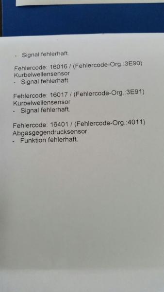 Den Fehlereinträgen nach hast du Probleme mit dem Luftmassenmesser, dem Partikelfilter, der Laufruheregelung, dem Abgasgegendrucksensor, einem Kurzschluß im Bereich der Lambdasonde, dem Kurbelwellensensor, und dem Abgasgegendrucksensor.