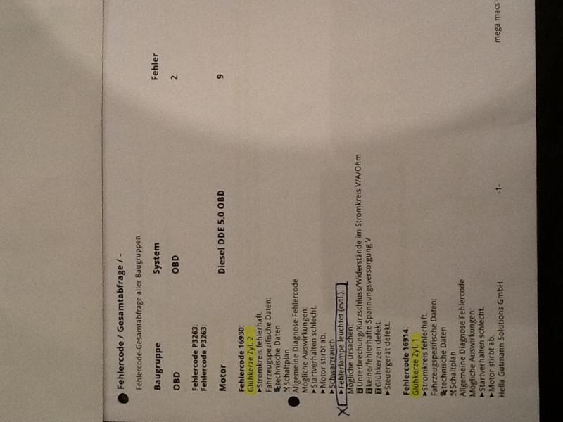 Als Anhang der Ausdruck aus dem Fehlerspeicher (Nr. 16930 und 16914) demnach leuchtet die Fehlerlampe evtl. bei einem Defekt der Glühkerze.