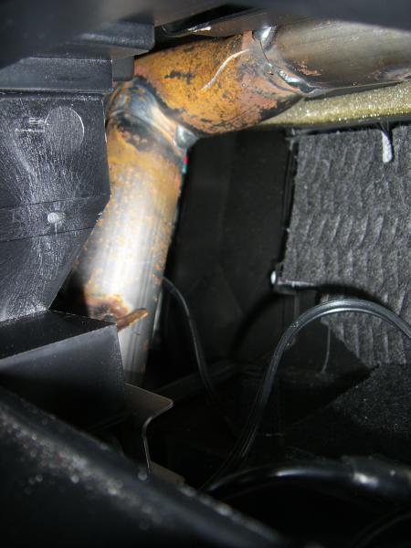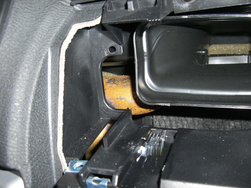 Hinter dem Radioschacht wird der Rohrrahmen sichtbar - oder ist das nicht der Rohrrahmen? Jedenfalls war hier alles rostig; sowohl links als auch rechts vom Radioschacht! Bilder siehe Anhang ...
