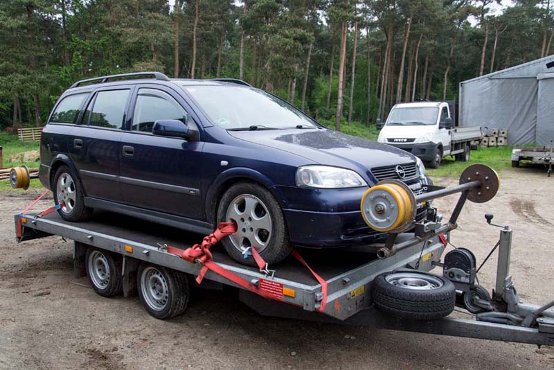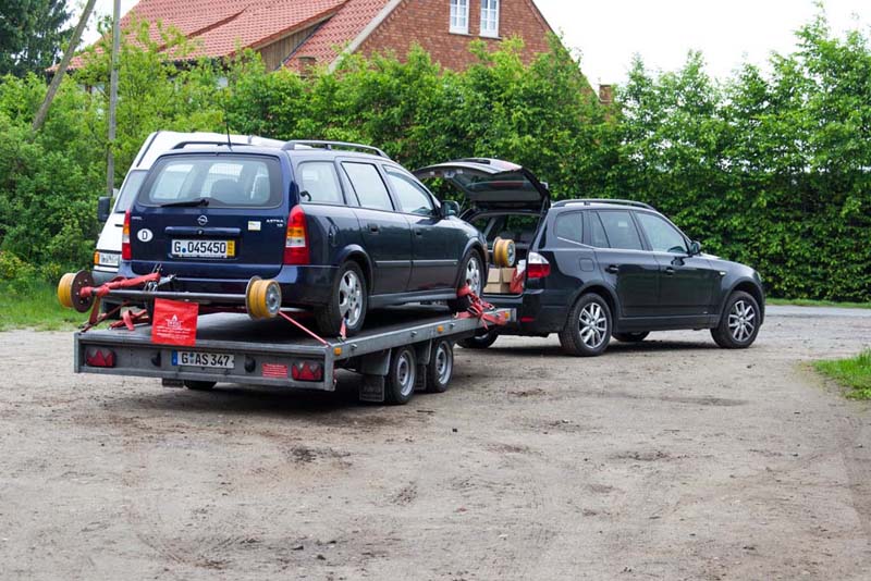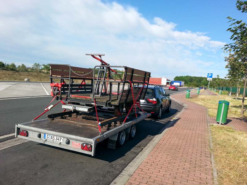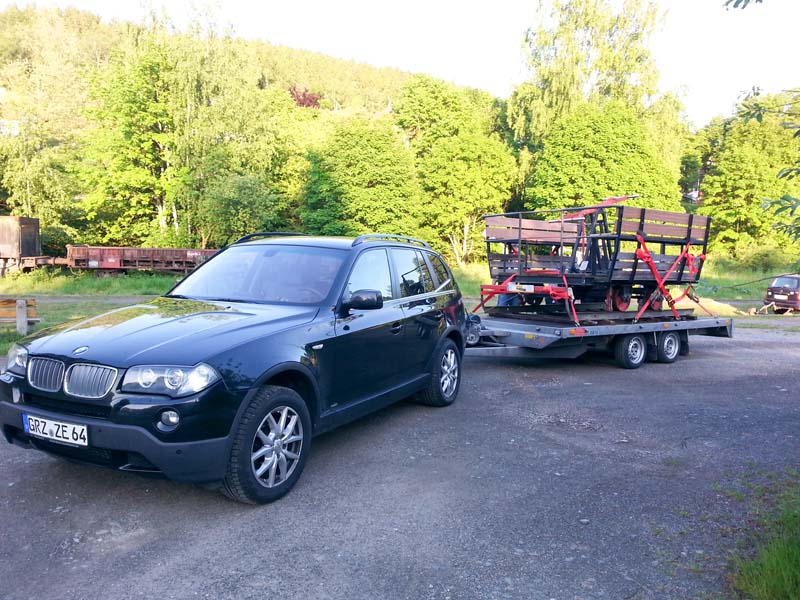 Bild 1+2 Rücktransport zum Hersteller wegen Umbauarbeiten, da der TÜV die Spielregeln geändert hatte. Bilder 3-5 ist die Abholung eines umgebauten Astra zum Befahren auf Normalspurweite. Die Draisinen auf dem Hänger hatte ich beim Fahren fast nicht gemerkt. Die sind leicht. Im Gegensatz zum Auto. Da waren die 2 Tonnen schon ziemlich ausgereizt.