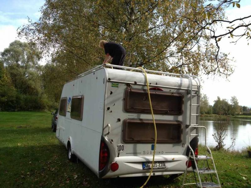 PS: Die schwarzen Flecken auf meinem WoWa sind keine Lack-Abplatzer, sondern Herbstlaub, das gerade vom Dach abgewaschen wird.