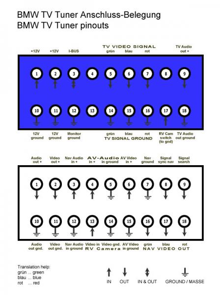 Die Masse des ersten Schließers, muss am blauen Stecker in Pin 17 eingepinnt werden. Dieses auf Masse geschaltete Signal, sobald das PDC aktiviert wird und dadurch das Relais die Schließer schließt, sagt dem TV-Modul, dass es auf die RFK schalten soll, damit vorne das Bild kommt. Gleichzeitig wird durch den zweiten Schließer die Kamera mit Strom versorgt, wodurch sie nur aktiv ist und Strom brauch, wenn sie auch wirklich gebraucht wird.