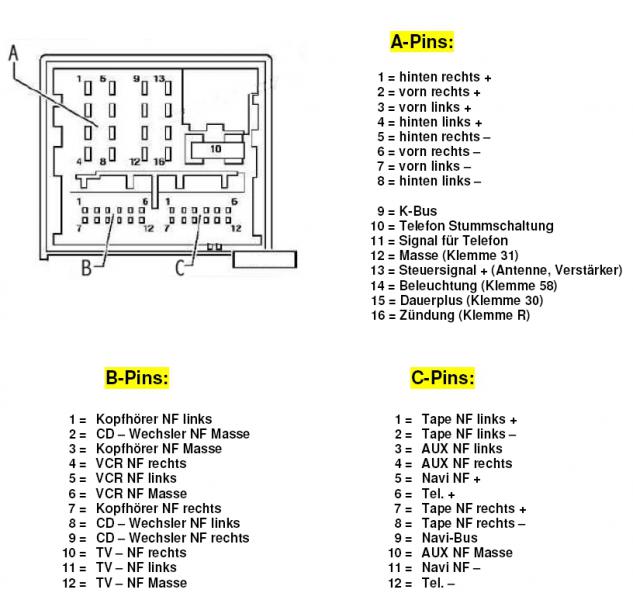 Jetzt hab ich es aufgegeben und mir ein Aux-In Kabel zum Nachrüsten besort. Da am Radio beide Stecker schon belegt waren hab ich die Drähte 1 zu 1 in den vorhandenen Stecker eingepinnt! ( Block C Pinn 3,4 und 10). Leider erscheint kein AUX am Radio! Er schaltet mit der Mode taste erst Radio, dann CD und dann Wechsler, danach kommt wieder Radio!