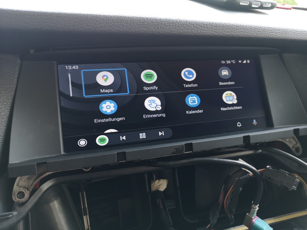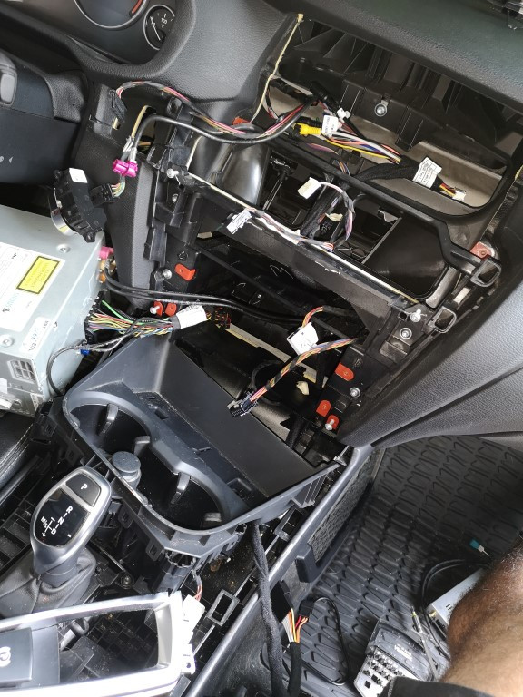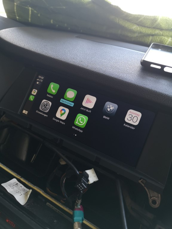 Eingebaut habe ich es zuerst mal nur provisorisch, wollte natürlich abchecken ob alles so funktioniert wie's soll. Für den ersten Check musste ich nur Display und iDrive Controller ausbauen, denn nur da werden die Kabel des Interface, welche erstaunlicherweise von 1a Qualität sind, zwischengesteckt, und et voila, es funktioniert einwandfrei. Mit meinem Huawei P20 Pro leider nur Kabelgebunden (Huawei-Google?) aber mit dem IP XS meiner Frau kabellos. Die beiden Systeme, also BMW und Car Play laufen parallell und zeitgleich, weshalb auch Radio und Rückfahrkamera ohne Probleme funktionieren und simultan umschalten.