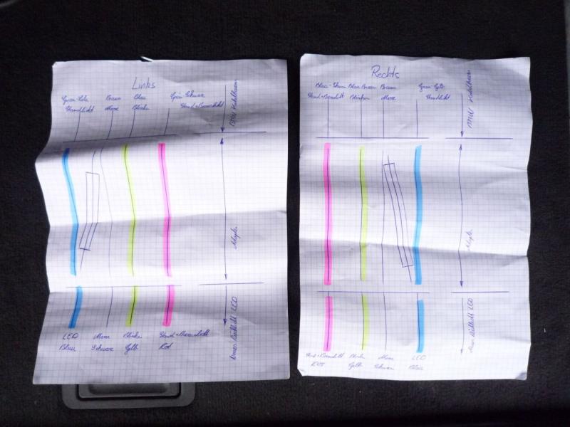 Hier sieht man einen von 4 Adapter (rechts aussen), die Kabel sind farblich auf die neuen Rücklichter abgestimmt und auch codiert um ein fehlerhaftes Anschliessen zu vermeiden.Die zwei Kabel, die vom Adapter weggehen stellen die Stromversorgung für die LED`s im Kofferraumdeckel rechts dar. Ist auf der linken Seite genau so umgesetzt.Die beiden noch nicht angesteckten Kabel werden nicht benötigt geben mir nur die Möglichkeit weitere Anschlüsse vorzunehmen (z.B. Kondensator um das Flackern zu unterbinden!?!)